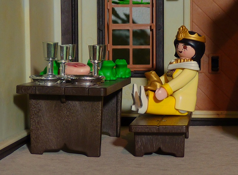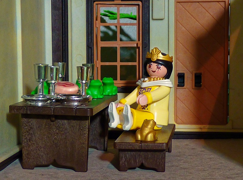 Da kam eine andere Kröte herbeigegangen und machte ihr auf. Wie sie eintrat, hießen alle sie willkommen, und sie musste sich setzen. Sie fragten: „Wo kommt Ihr her? Wo wollt Ihr hin?“ Da erzählte sie alles, wie es ihr gegangen wäre, und weil sie das Gebot übertreten hätte, nicht mehr als drei Worte zu sprechen, wäre der Ofen weg samt dem Königssohn.