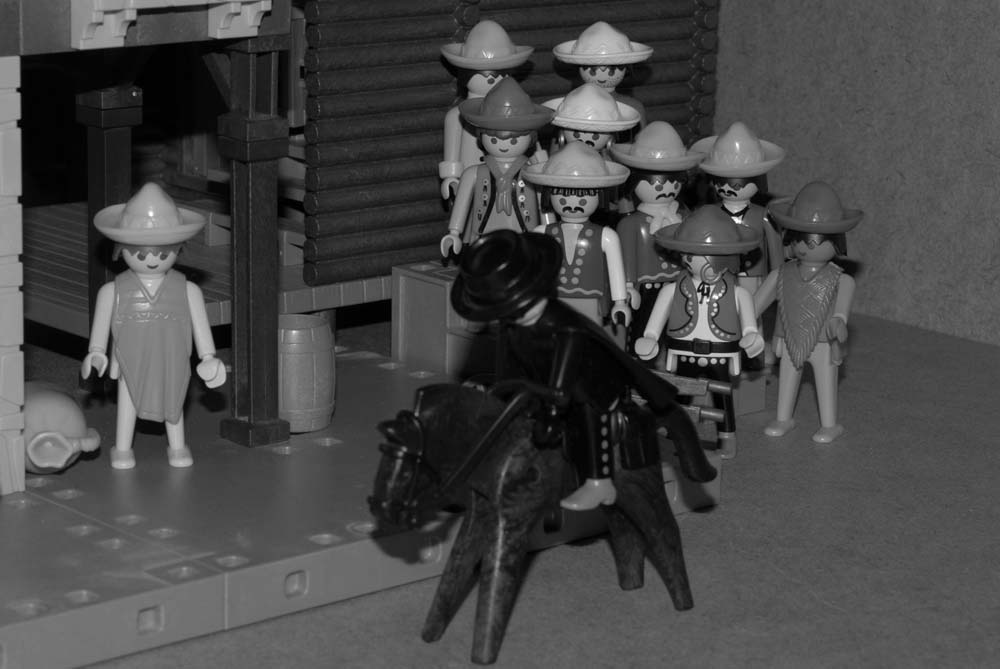 Alejandro: „Man hat mich rausgeworfen, sie hätten sonst den Peonen die Häuser verbrannt. Der Pater drängt uns nun zu einer Revolte, die aber keinen Erfolg hätte, bei einer Garnison gefüllt mit Soldaten. Außerdem ist Gesetz Gesetz. Ich will nicht rebellieren gegen die Obrigkeit meines Landes.“