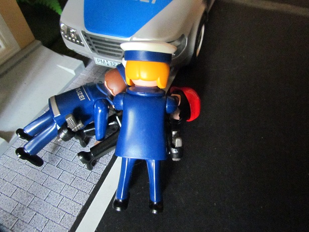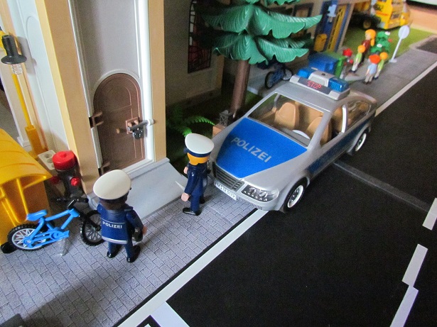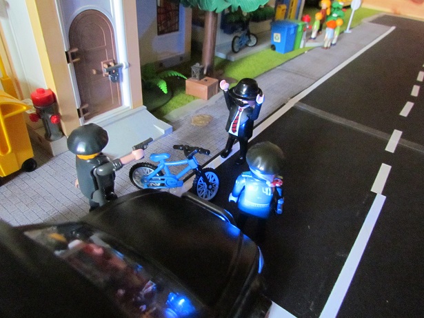 Der Mann hat sich ein Fahrrad genommen. Die Polizisten verfolgen ihn mit dem