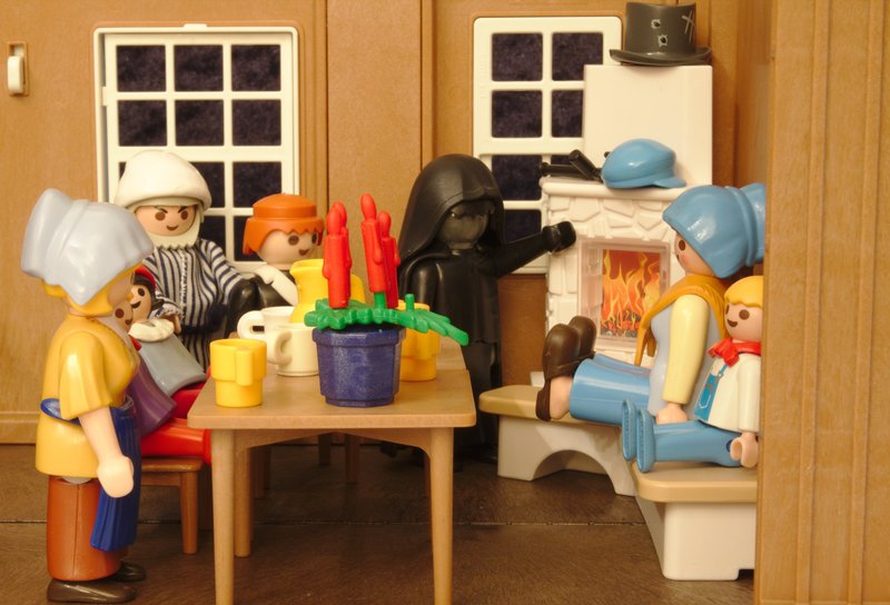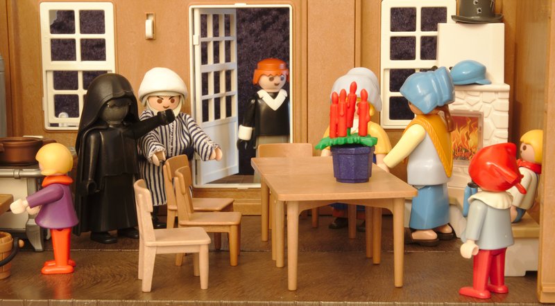 - Im Zimmer herrscht eine tiefe Stille. „Euer Vater muss bald kommen.“ sagt die Mutter. „Er ist fast schon ein bisschen spät.“ meint Peter. „Er geht in letzter Zeit etwas langsamer als früher.“ fügt er hinzu. „Ich weiß noch, wie er mit Tiny Tim auf den Schultern gelaufen ist, wirklich sehr schnell.“ antwortet die Mutter mit leicht unsicherer Stimme und die Kinder nicken bestätigend. In dem Moment kommt der Vater nach Hause.