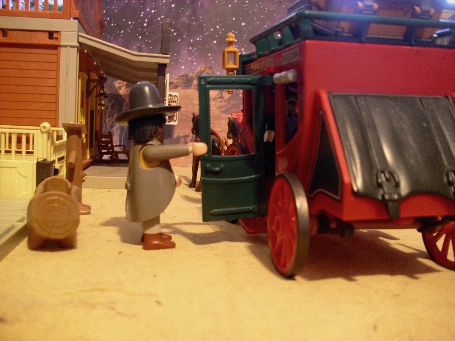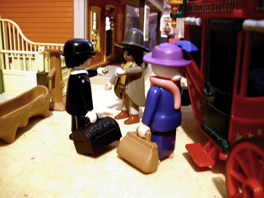 Von draußen hören sie den Kutscher die Pferde stoppen und die Kutsche kommt zum Stehen. Die beiden Passagiere hatten seit Beginn ihrer Unterhaltung nicht mehr aus dem Fenster gesehen und so gar nicht mitbekommen, dass sie einen kleinen Ort erreicht haben. Dann öffnet sich die Tür und der Kutscher schaut herein. „Wir sind in Bevertown. Hier geht es morgen früh weiter. Dort drüben ist ein Hotel.“ Seine schwieligen Finger zeigen zu einem Haus die Straßen hinunter.