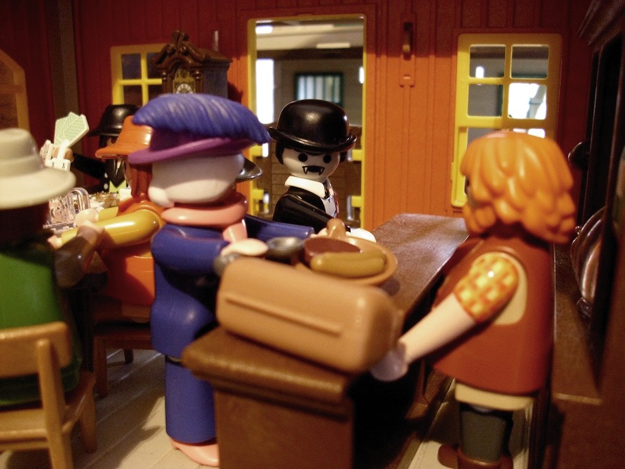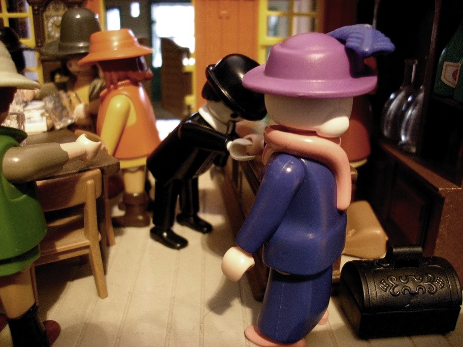 Lucie Carpek und Danteslav Orlok schlendern derweil zum Saloon hinüber. Sicher ist Danteslav klar, dass es höchst unpassend wäre, hier seinen gewohnten Speiseplan einzuhalten. Zumal das Dorf kaum größer ist als die kleinen Dörfer rund um die Burg seiner Ahnen. Nein, das wäre höchst unpassend und gefährlich. Es ist Silvester – nicht nur irgendein Silvester, sondern der Beginn eines neuen Jahrhunderts – alle werden wach sein und wenn er ehrlich war, würde er den Abend auch lieber mit Frau Carpek verbringen als auf der Flucht. Die Pendeltür schwingt hinter ihnen wieder zusammen. Wie Danteslav bereits erwartete, ist der Raum voller Menschen. Sie sitzen an den Tischen, trinken, spielen Karten und krakeelen herum. An der Seite sitzt ein Kerl am Klavier und gibt was er kann, während eine recht leicht bekleidete Dame auf der kleinen Bühne ihr Bestes gibt, um das Publikum zu unterhalten. Hinten in der Ecke gibt es noch einen kleinen Tisch, an dem niemand sitzt. Der Wirt scheint ihn heute extra sauber gemacht zu haben. Ach, nicht schon wieder sitzen, denkt sich Lucie. „Lassen Sie uns doch zur Bar vorgehen. Da sieht man uns wenigstens.“ Schlägt sie vor. Da Danteslav sowieso nichts essen will, ist es ihm egal und sie gehen durch den Raum hindurch unter den Blicken der Einheimischen zur Bar.