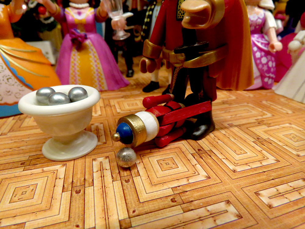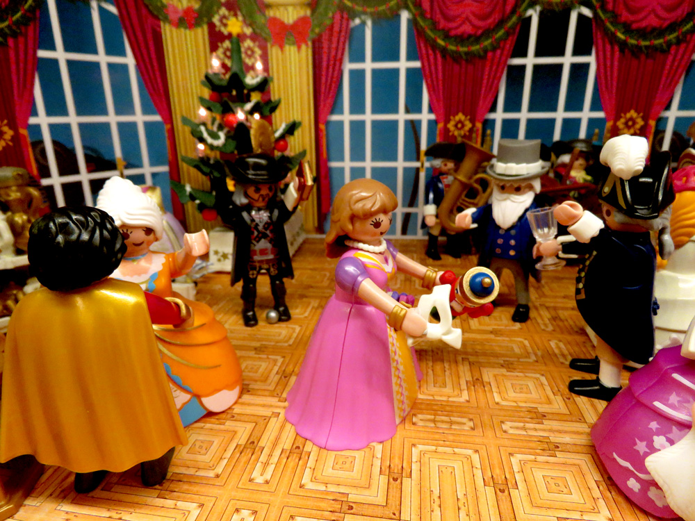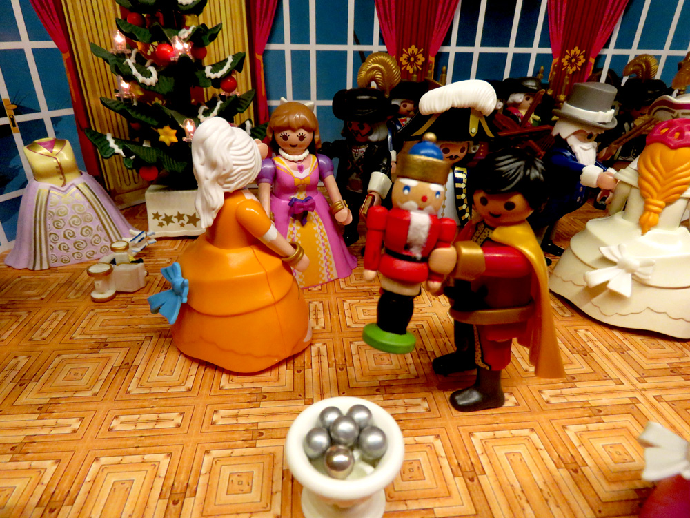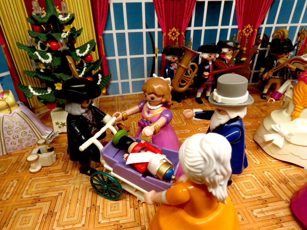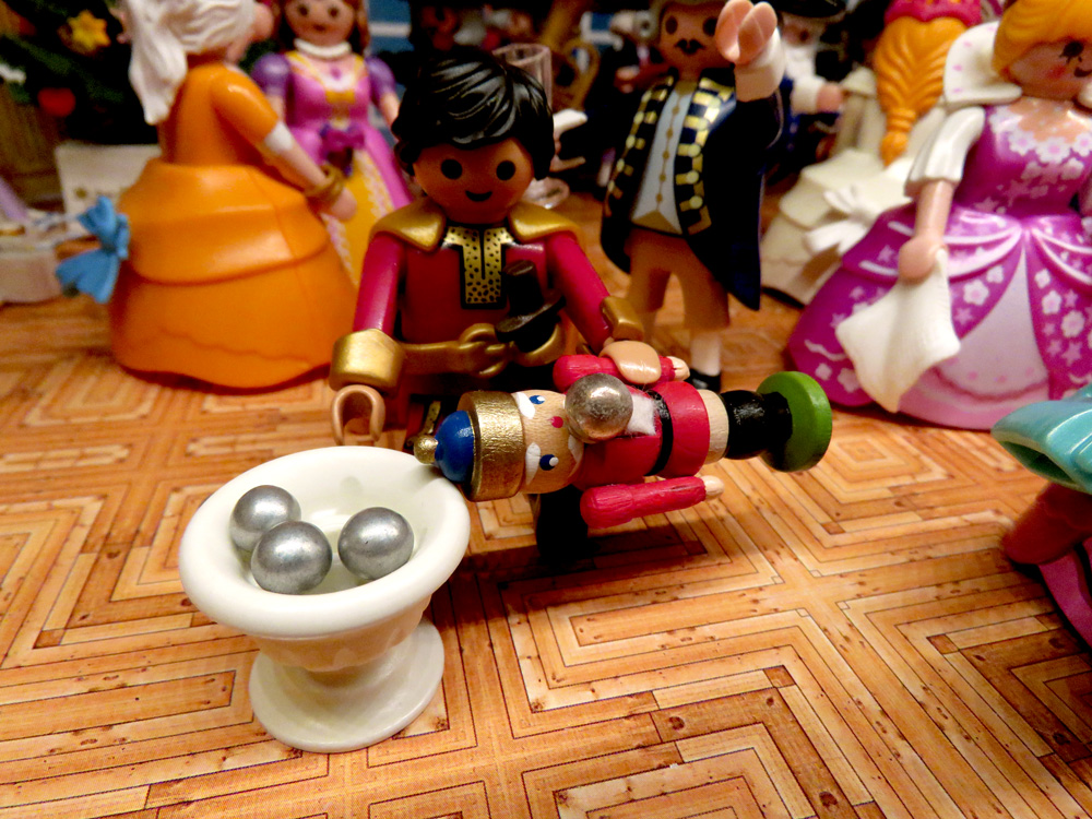 Die Eltern und auch der Pate Drosselmeyer gaben Fritz recht und so musste Marie hilflos zusehen, wie Fritz den Nussknacker mit zu seinem bunten Teller nahm. Was sie allerdings nicht sehen konnten war, dass auf Fritzens buntem Teller auch seine Kanonenkugeln seines Regiments (die Zinnsoldaten waren ihm verboten worden mit zum Fest zu nehmen, damit sie nicht kaputt gingen aber den Kugeln konnte ja kein Kind etwas anhaben.)