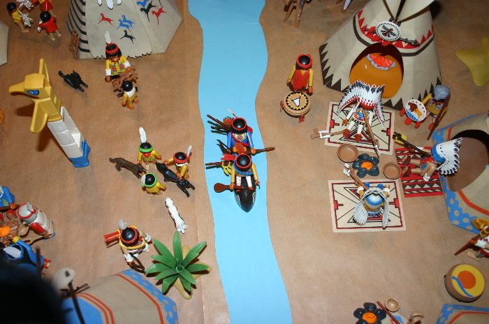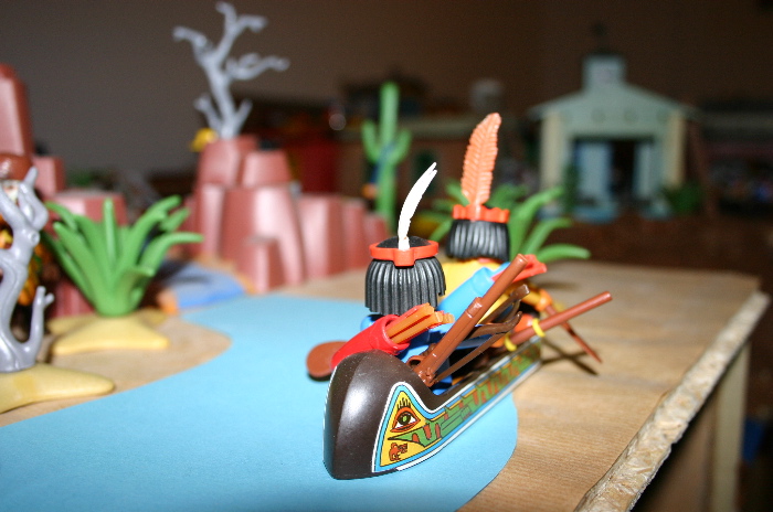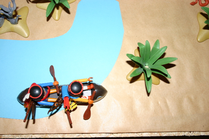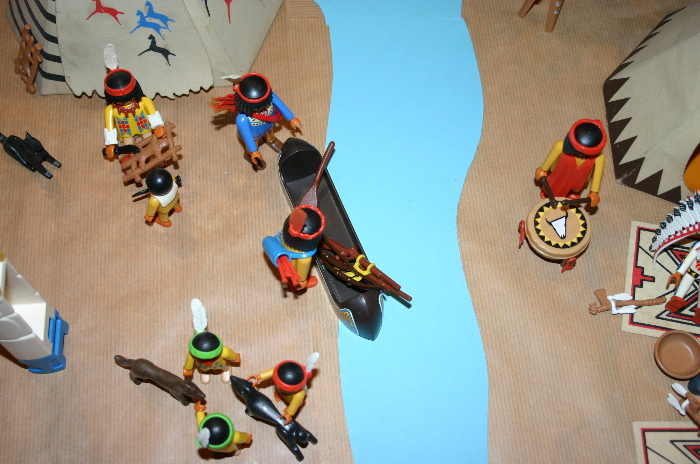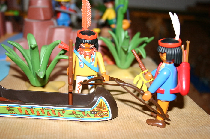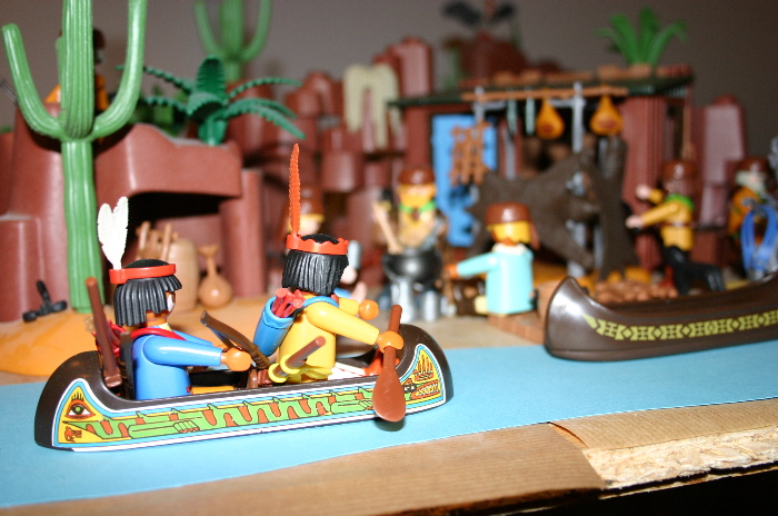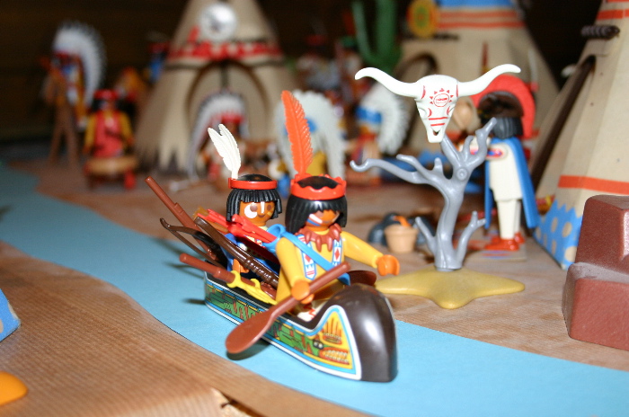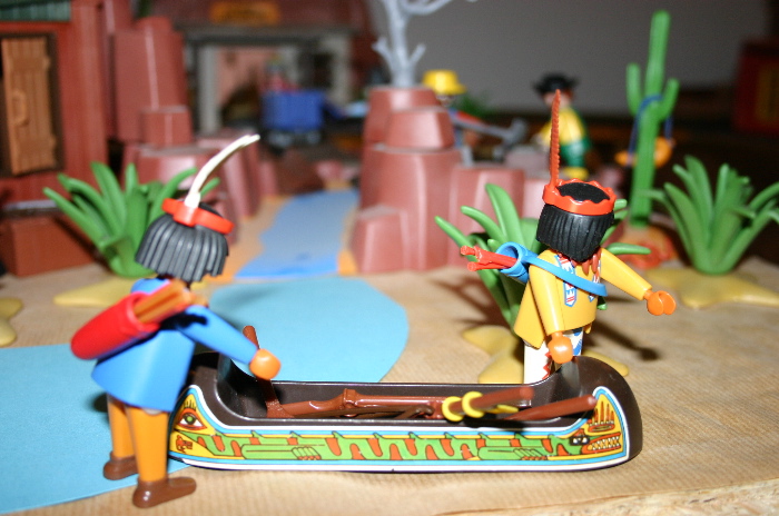 Die beiden Krieger, weiße Feder und listiger Fuchs, gingen zu einem Kanu, welches schon mit Ihrer Ausrüstung beladen war, und schoben es in den Fluß. Die beiden Krieger stiegen ein und fingen an zu paddeln bis das Kanu langsam Fahrt aufnahm.