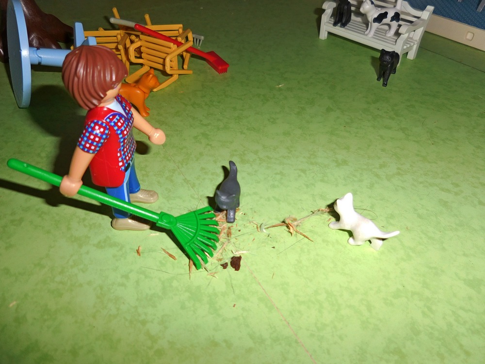 den die Katzen verteilten, wieder auf einen Haufen zu bringen.