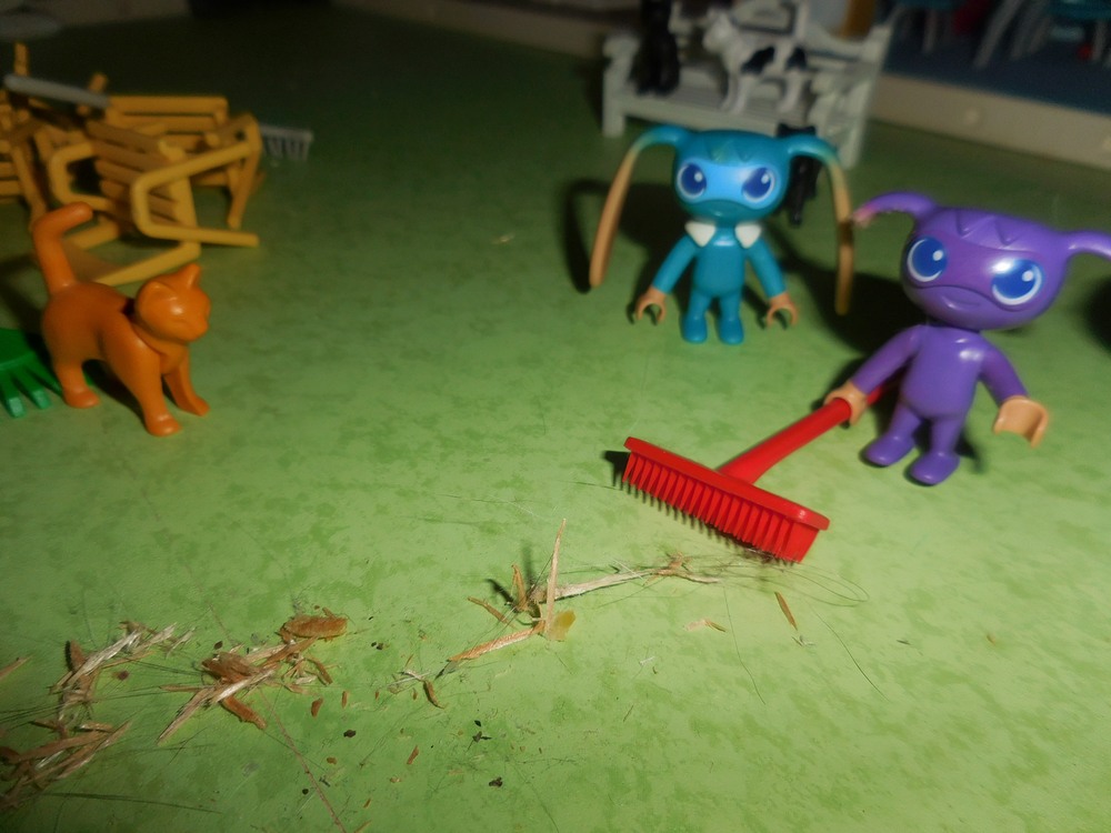 Das Mädel greift sich den Besen und müht sich ab, den Schmutz,
