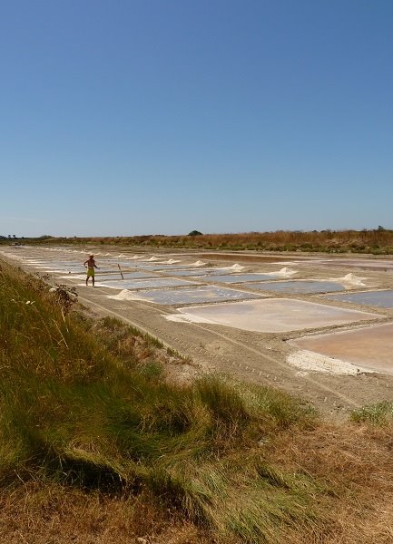 In große flache Teiche wird, mit Hilfe der Flut, wenn ich nicht irre, das Seewasser geleitet und durch den einfachen Prozess der Verdunstung auf Seesalz hin bearbeitet. Mit großen Krücken, den ‚râbles‘ werden die Kristalle herausgefischt... Auf Meilen hin sieht das Auge nichts wie Wiesen... und Teiche. Sehr monoton, aber sehr eigentümlich.
