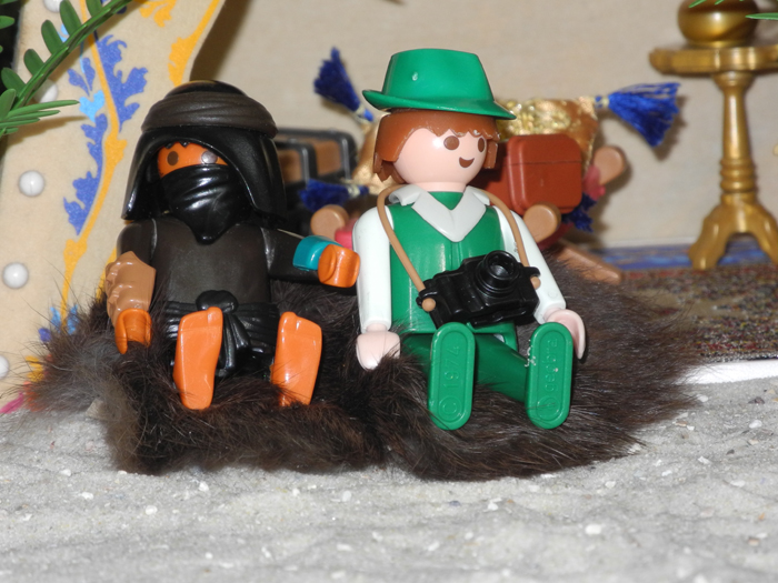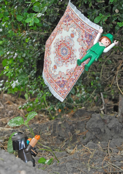 "Das ist ein kleiner Teppichflitzer, der letzten Dschinngeneration. Du musst dich nur auf ihn setzen, die Steuerbommel für rechts und links in die Hand nehmen und dann Hoch, Runter, Vorwärts und Halt rufen. Den Rest macht der Teppich dann von selbst. Du wirst sehen: Alles ganz sicher. Das ist Qualität. Und jetzt einfach drauf los und eine kleine Runde ums Lager fliegen."
