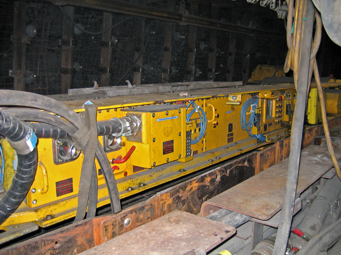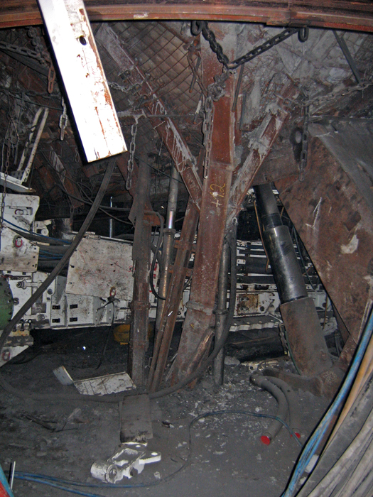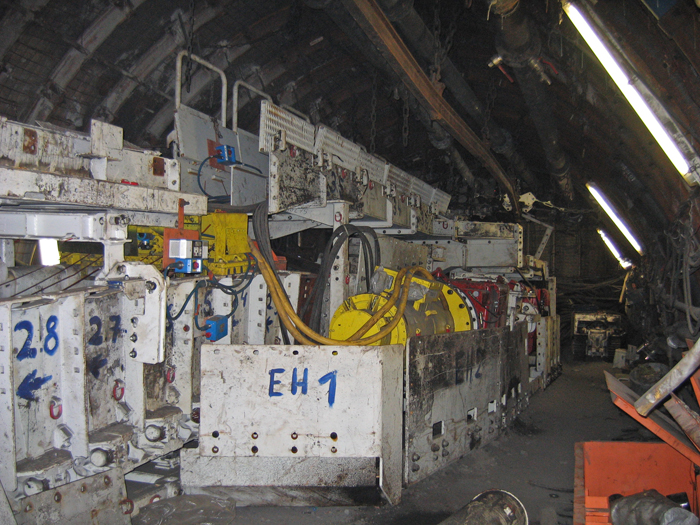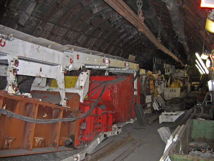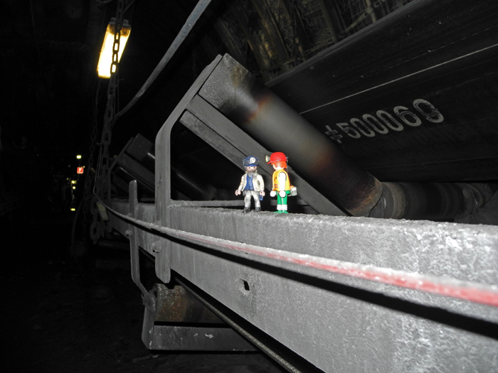 „Hier stehen wir in einem zukünftigen Streb in dem die Schremwalze, dass ist das gelbe Ding, die Kohle aus dem Gestein fräst!“