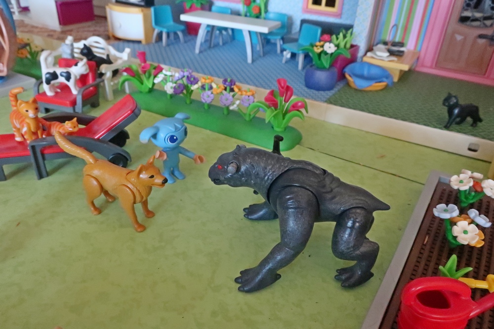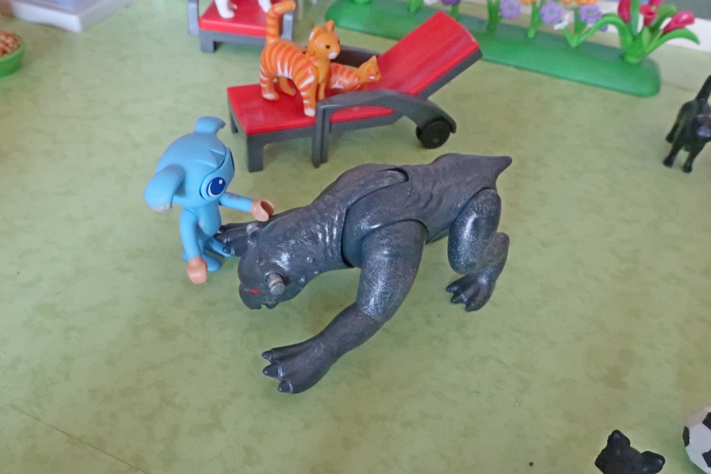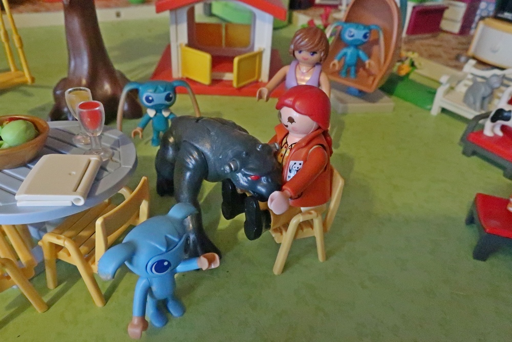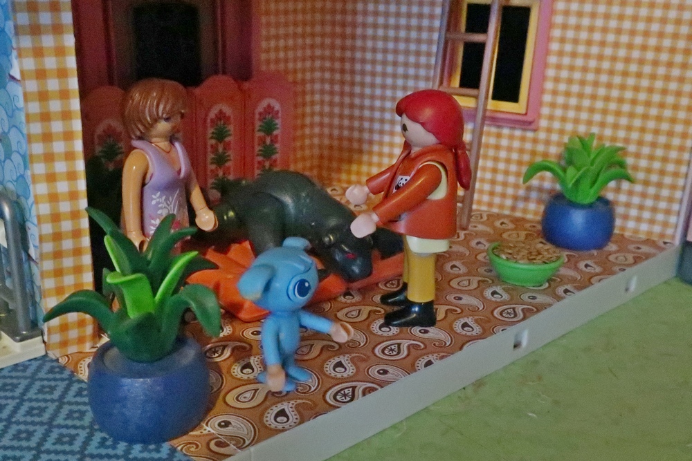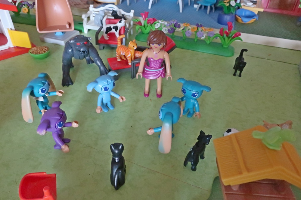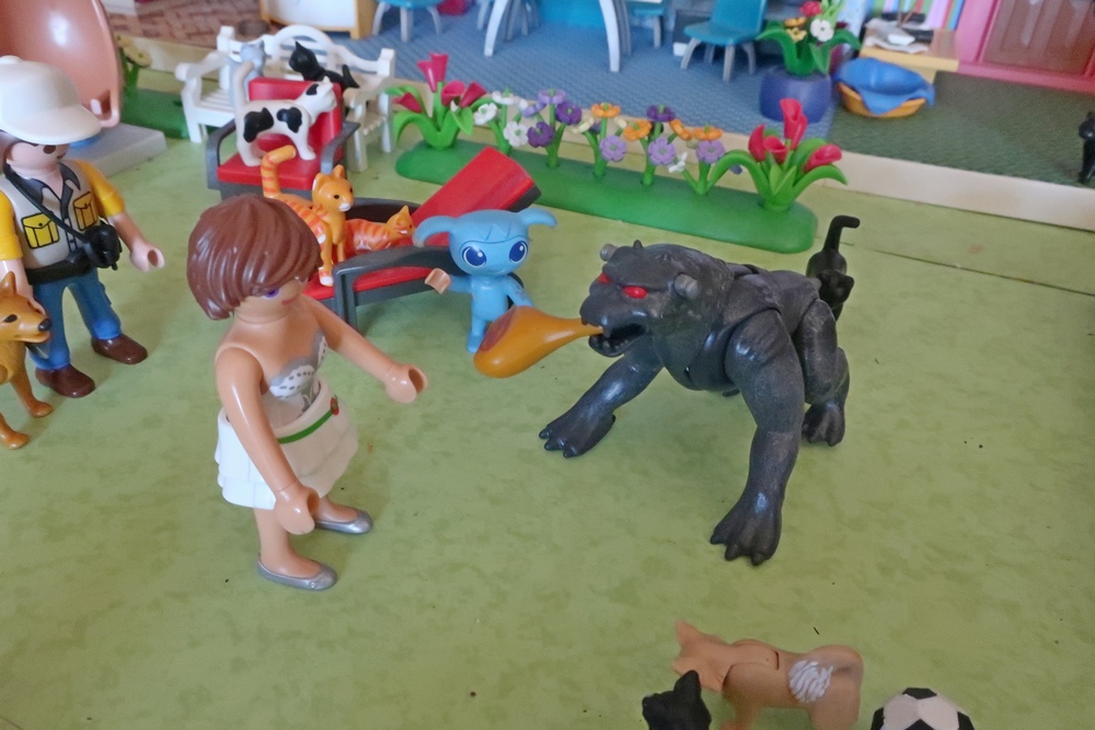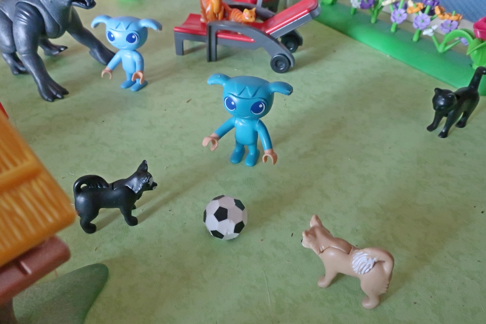 als er nun mit den Hunden, Katzen, Kikis und mir spielen darf.