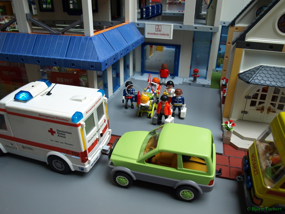 "Guten Tag, hier ist Frau Krause, eine Kundin ist zusammen gebrochen und klagt über Schmerzen im Brustbereich. Wir brauchen dringend ein Notarzt. Das ganze ist in der Arneken Galerie, in der Bäckerei im zweiten Obergeschoss."