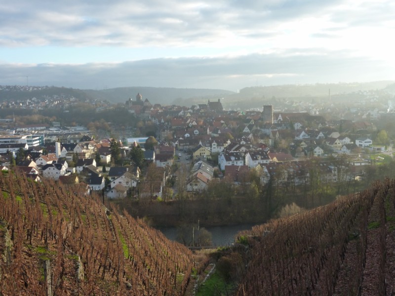 - Auf dem Aussichtspunkt der "schönsten" Weinsicht, Blickrichtung Süden über Besigheim. Zu sehen die Steillagen oberhalb der Enz. Hier kommt der sehr bekannte Württemberger Wein her! Evtl. ist Weinkennern die "Besigheimer Felsengartenkellerei" ein Begriff.