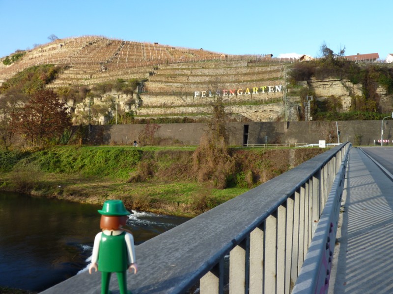 Auf dem nächsten Bild befinden wir uns auf der Enzbrücke der Bundesstraße 27, Blickrichtung Walheim. Autofahrer werden durch den riesigen Schriftzug im Fels auf die Wein-Steillagen aufmerksam gemacht. Unterhalb der Brücke sind die letzten Meter der Enz recht reißerisch, und werden daher im Sommer gerne von Surfern benutzt, die ihre Bretter verankern, und auf der Strömung reiten.