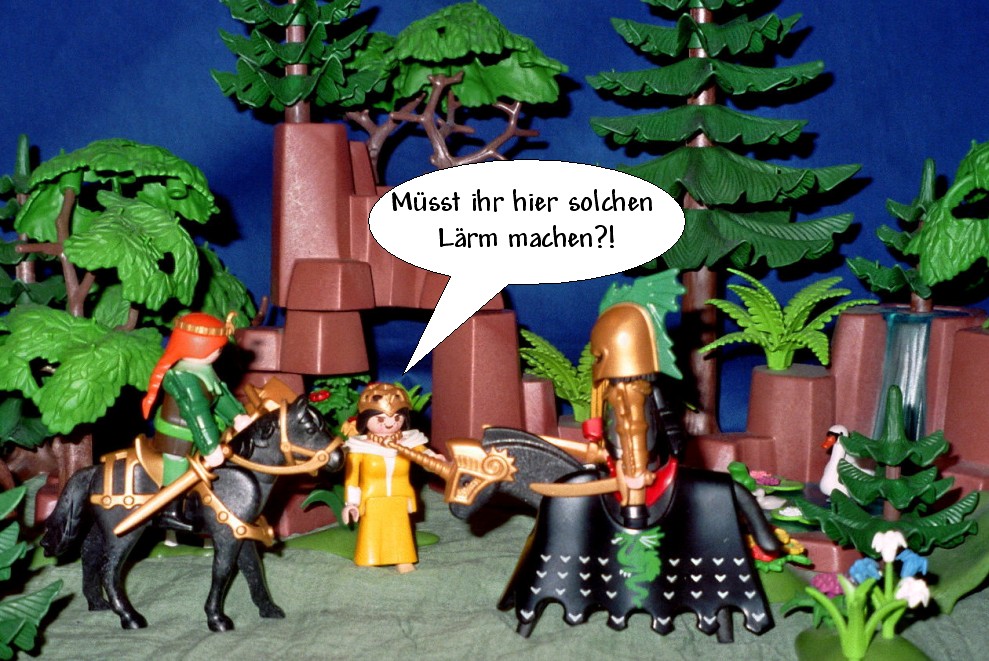 „Habt Ihr Euch auf dem Weg zum Tunier verirrt? Oder erschreckt Ihr einfach lieber die Waldtiere, anstatt die Mitkämpfer auf dem Kampfplatz?“ fragte Petronella.