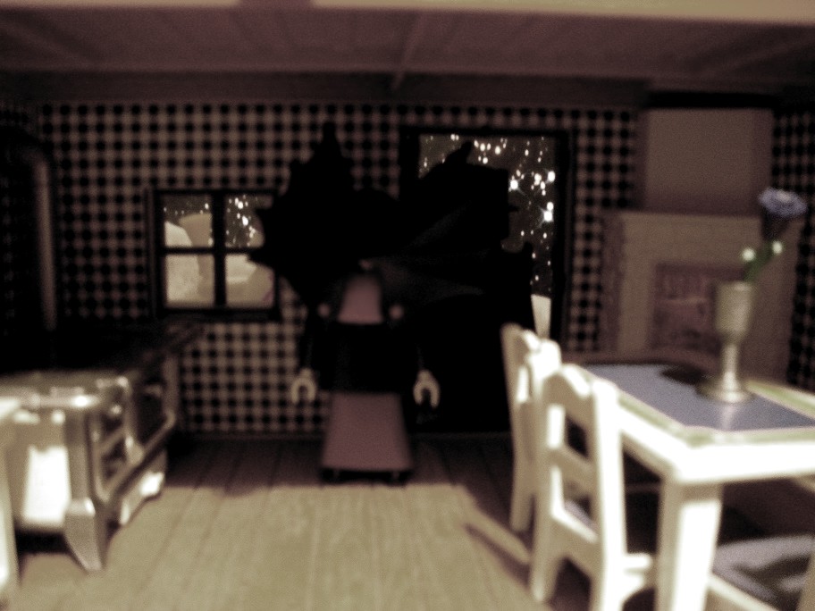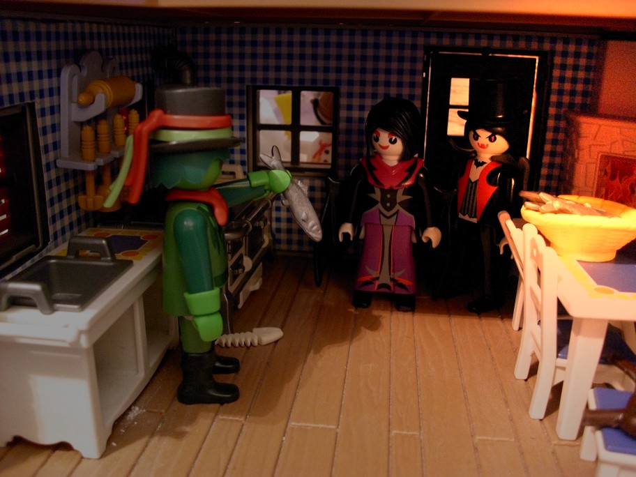 Vlad: „Feuerschein. Ich hoffe, es brennt nicht!“ Betty: "Ah, der Kamin.“