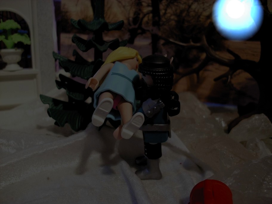 Er nimmt sie auf die Arme und trägt sie Richtung Schloss
