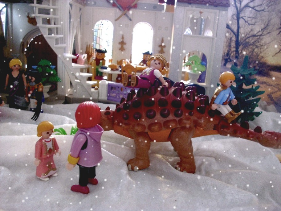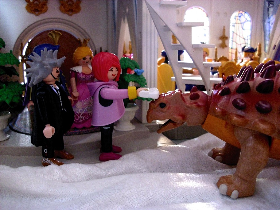 „Ungezogener Kylie!“ schimpft Polly den Saurier und haut ihm vorsichtig die Handtasche auf die Nase. „Das macht man doch nicht.“