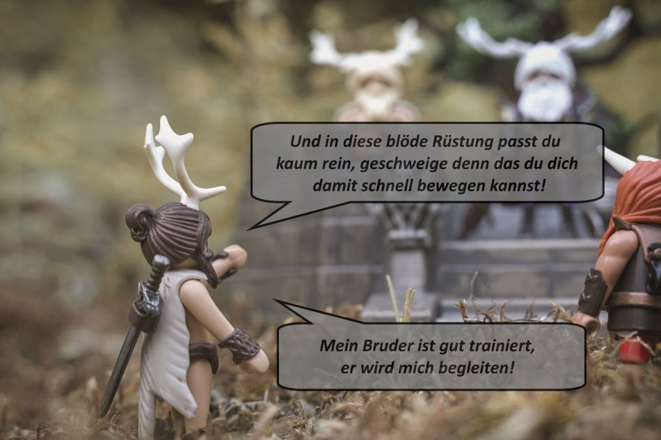 Am Morgen als ich die Bilder machen gehen wollte ist mir aufgefallen das die Gute dem Bären erzählt sie hätte ihm ein Steak eingepackt, sie aber gar keinen Rucksack o.ä. dabei hat, daher hat der Köcher kurzerhand eine Tasche bekommen, also nicht das ich mich so richtig um Realismus kümmern würde aber ich dachte das macht mehr Sinn