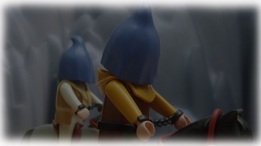 „Doch das Gesindel wollte kein Geld. Sie fesselten uns. Dann stülpten sie Säcke über unsere Köpfe, so dass wir nicht sehen konnten, wohin sie uns brachten. Es dauerte mehrere Tage. Nur wenn wir rasteten oder schliefen, befreiten sie uns von den Säcken. Wir wurden streng bewacht, uns bot sich keinerlei Möglichkeit zur Flucht. Schließlich brachte man uns in eine Höhle oder etwas ähnliches. Wenn es denn möglich war, es wurde noch dunkler um uns. Das Atmen unter den Säcken fiel uns immer schwerer. Irgendwann hielten wir an, und fremde Stimmen und Geräusche waren um uns.“