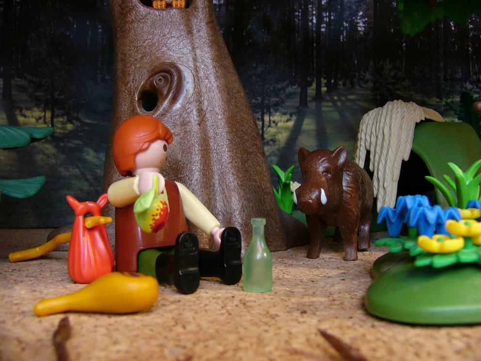 Da rauschte es ganz stark in den Büschen, und es brach ein wildes Schwein heraus, das grunzte: „Qui oui oui", und sagte: „Es hat hier jemand zum Essen gerufen! ich weiß nicht, ob du es warst und ob ich gemeint bin?“ „Immerhin, lange nur zu, was da ist!“, sprach der Wandersmann, und da aßen sie beide wohlgemut miteinander, und es schmeckte beiden gut. Darauf erhob sich das wilde Schwein und sagte: „Habe Dank, bedarfst du mein, so rufe dem Schwein!“ und damit trollte es in die Büsche.