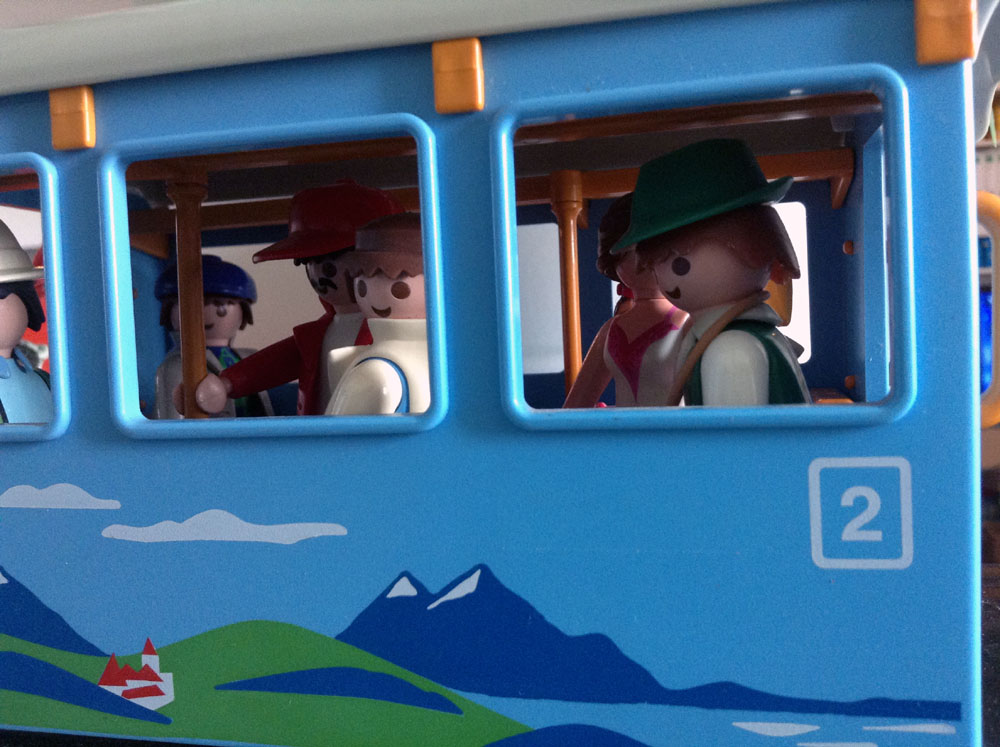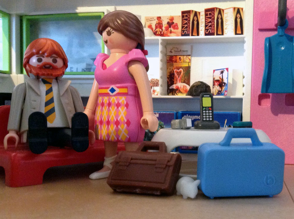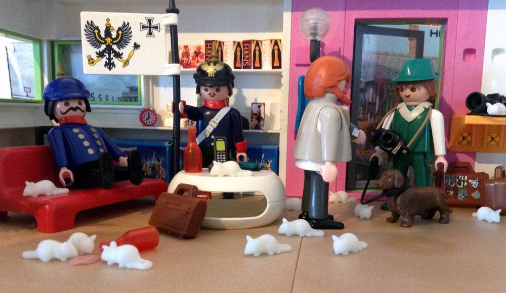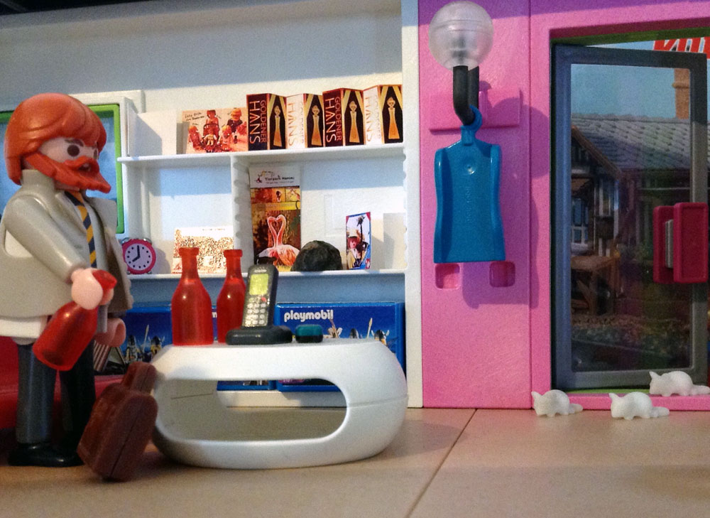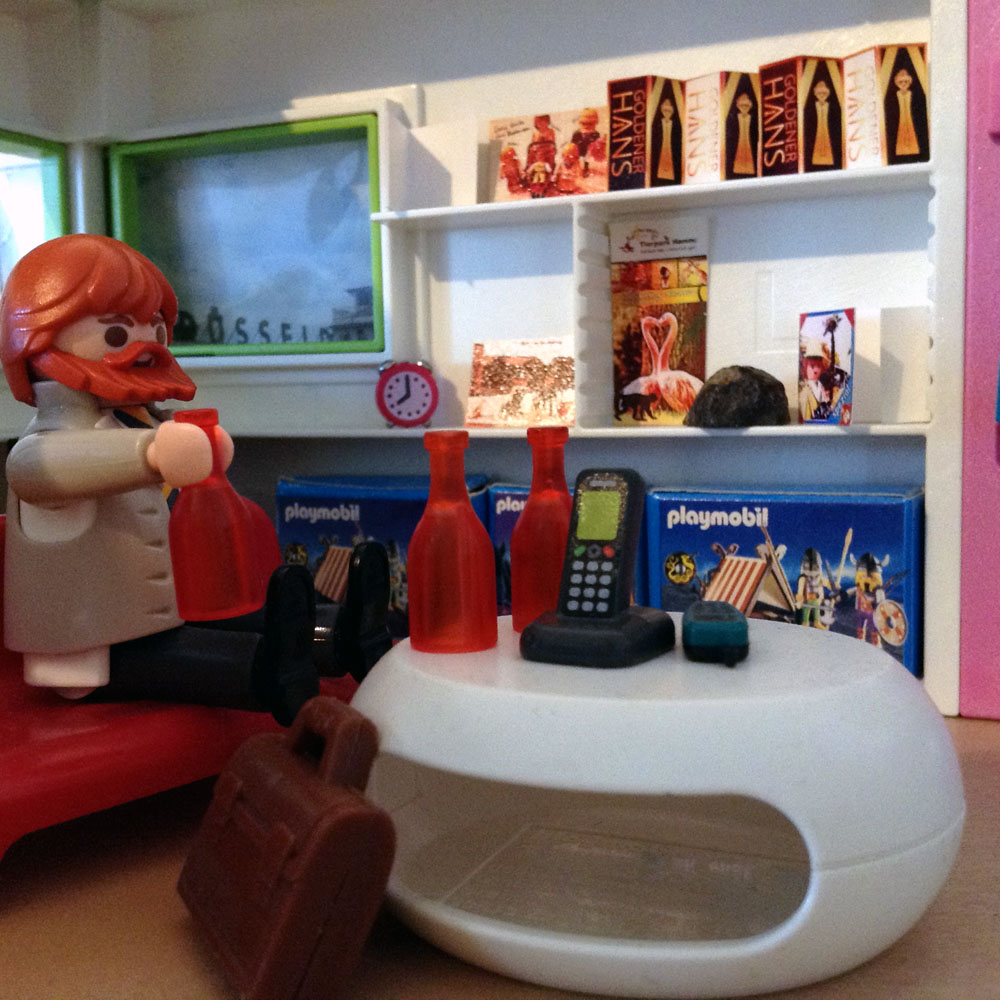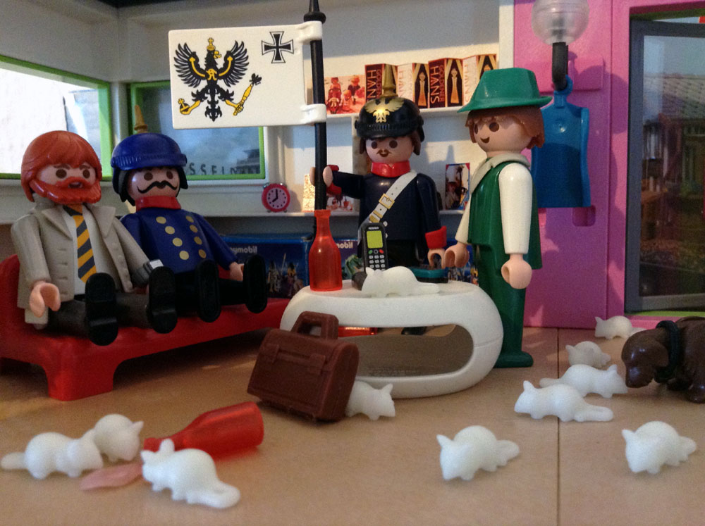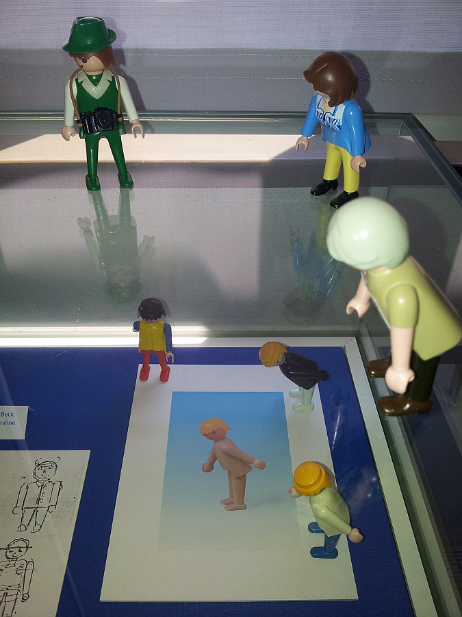Klar, uns interessiert vor allem der Playmobil-Schaukasten mit Zeichnungen von Hans Beck und Figurenteilen.