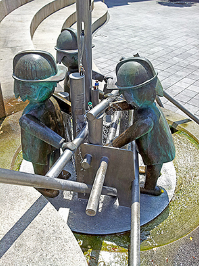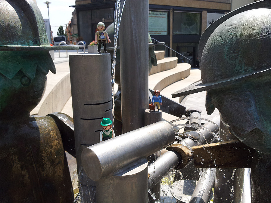 Der „Playmobil-Brunnen“ mit den lebensgroßen Bronze-Bauarbeitern, den sprudelnden Rohren