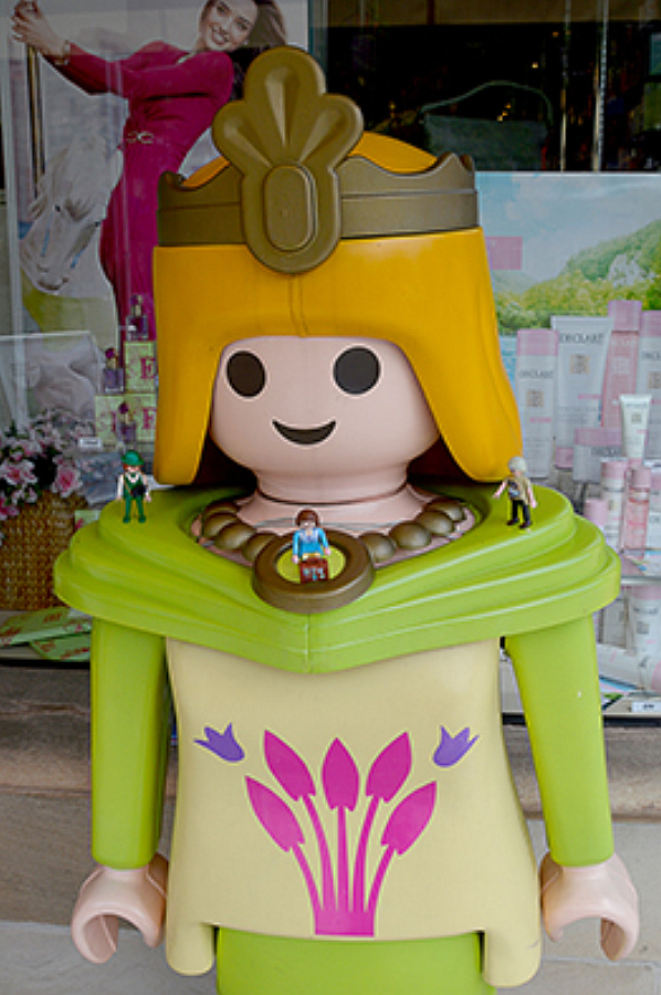 Oh, sogar einer Prinzessin begegnen wir auf dem Weg dorthin. Vor der Parfümerie begrüßt sie stilvoll die Kunden.