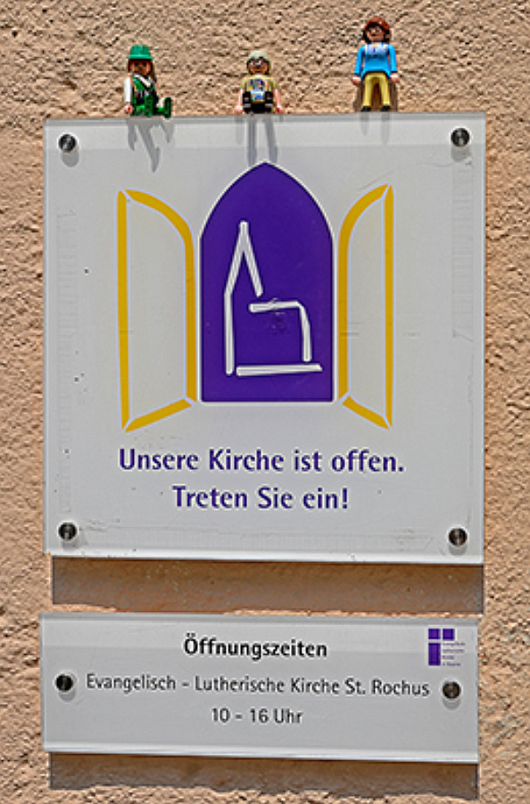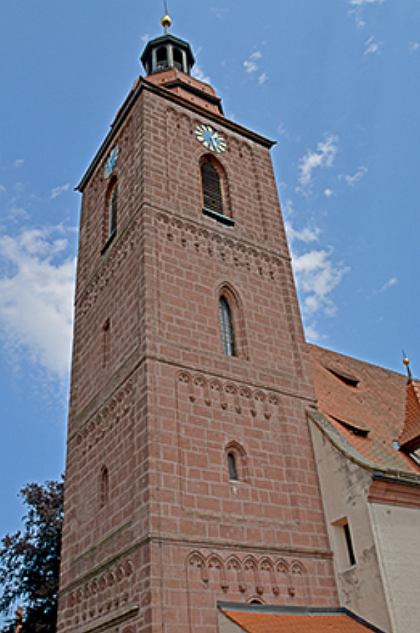 Durch den Pfarrhof kommen wir zur evangelischen Stadtkirche St. Rochus mit ihrem hohen, reich verzierten Turm.