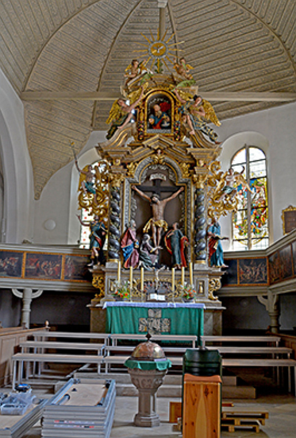 Eine Besonderheit im Kirchenschiff, das gerade renoviert wird, sind die Emporengemälde mit Szenen aus dem Alten und Neuen Testament.