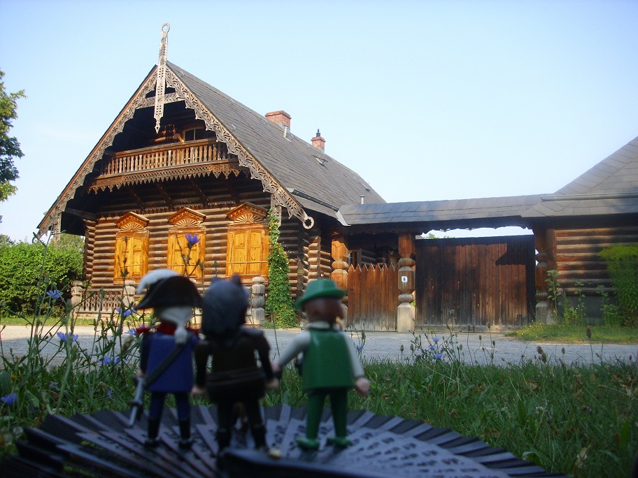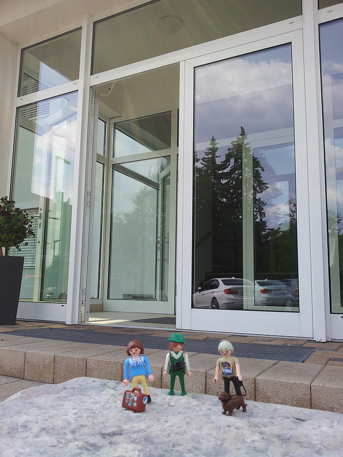 Also gehen wir drei durch das Tor. Und sehen ein Haus mit seltsamen Fenstern.