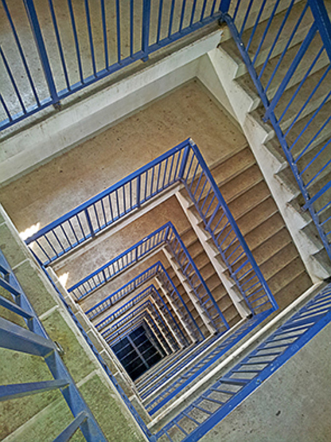 Im Treppenhaus zögern wir kurz: Sollen wir uns den Aufstieg bei diesen Temperaturen tatsächlich antun?