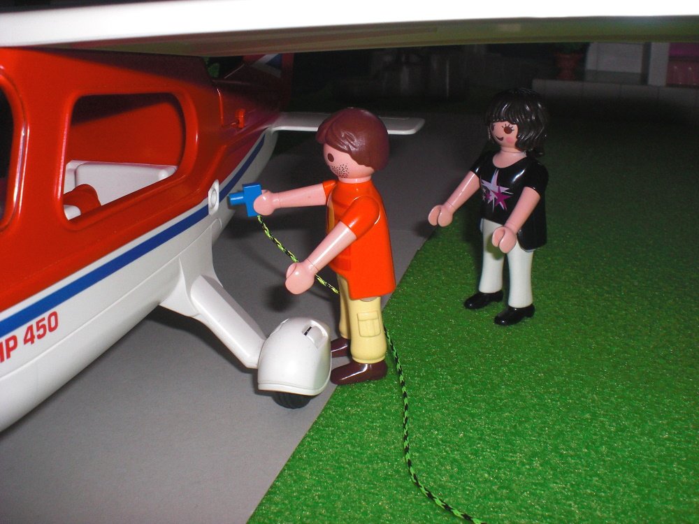 Nachdem Lucas das Flugzeug geparkt hat, sichert er es.