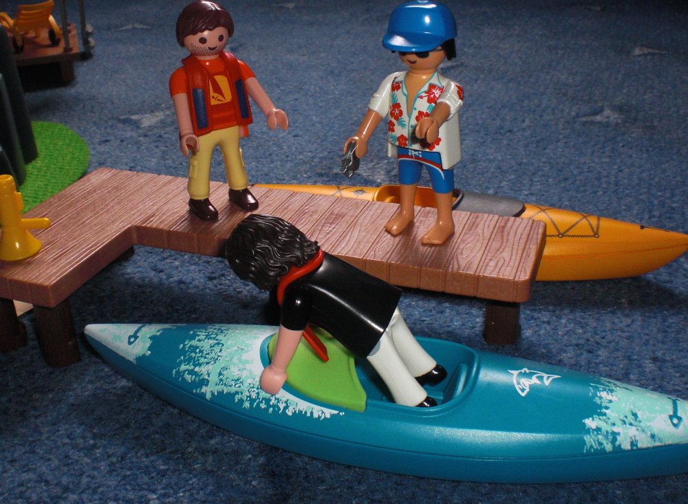 Beim Kajakverleih angekommen, redet Lucas mit dem Mitarbeiter.