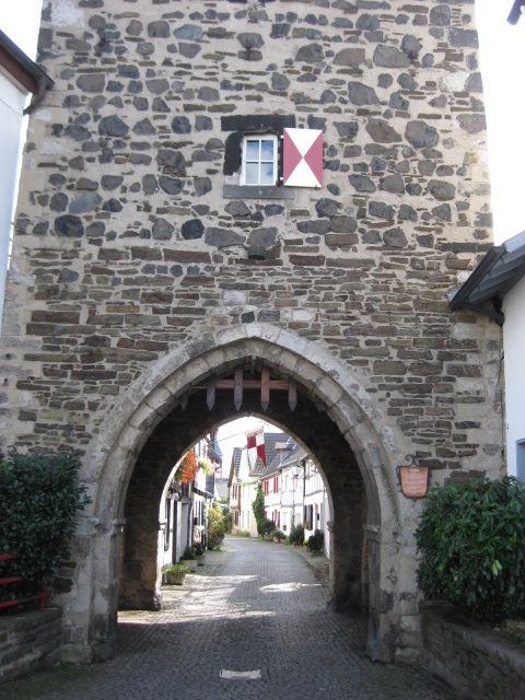 Durch das Neutor kann man schon die alten Fachwerk Häuser Erpels sehen und den Turm der Kirche.