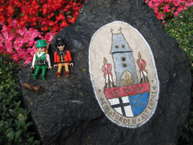 Solche Steine kann man an vielen Ecken in Erpel finden .Meist mit Erpeler Wappen. Sie werden von einen Freund von John Wayne, liebevoll bearbeitet, bemalt, und für ein Entgeld überlassen.