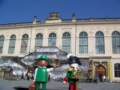 DerSachse: Mach dir nichts draus, die Frage taucht bei fast allen Touristen auf, die ganzen Stadtführer sind schon genervt, aber dagegen kann man nichts machen. Wenn wir uns einmal umdrehen, sehen wir das Residenzschloss. Einst war es diente als Regierungssitz der sächsischen Kurfürsten uns Könige, allen voran August der Starke. Heute beherbergt des die Schatzkammer August des Starken, das Grüne Gewölbe. Weiterhin befindet sich hier die Türckische Kammer, auch ein Museum, außerdem die Münzsammlungen und das Kupferstichkabinett. Im Zwinger hat man zu damaliger Zeit gelustwandelt und gefeiert. Heute ist der Zwinger für jeden zugänglich und beherbergt den Mathematisch-pysikalischen Salon, die Rüstkammer und die Porzellansammlung. Zur Zeit finden hier die Zwingerfestspiele statt. Es gibt übrigens auch ein Glockenspiel mit Glocken aus Meißner Porzellan. Das ist das berühmte Kronentor des Zwingers. Hier wird mal wieder restauriert. Felix' Blicke streifen zum Schauspielhaus, als er mich auf einmal auf einen Schriftzug aufmerksam macht.