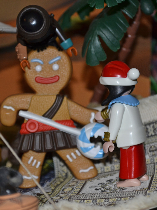 "Das sehe ich. Ist das nicht ein bischen gierig den Keksmann so anzuknabbern?"