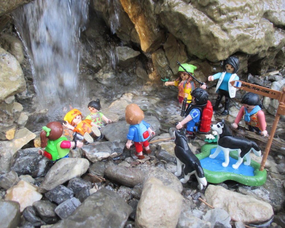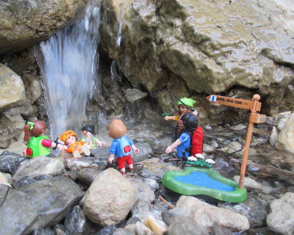 Plötzlich sehen wir von weitem an einer Gebirgsquelle eine Wandersfamilie mit den zwei vermissten Kindern.