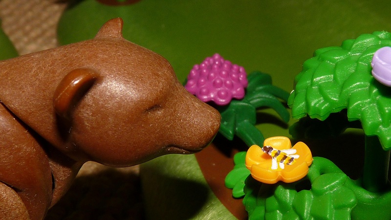 Die Biene begegnete ihm, und da sie merkte, dass es ihm in seiner Haut nicht wohl zumute war, sprach sie: „Bär, du machst ja ein gewaltig verdrießlich Gesicht, wo ist deine Lustigkeit geblieben?“ „Du hast gut reden“, antwortete der Bär, „es sitzt ein grimmiges Tier mit Glotzaugen in dem Hause des Roten, und wir können es nicht herausjagen.“ „Die Biene sprach: „Du dauerst mich, Bär. Ich bin ein armes schwaches Geschöpf, das ihr im Wege nicht anguckt, aber ich glaube doch, dass ich euch helfen kann.“
