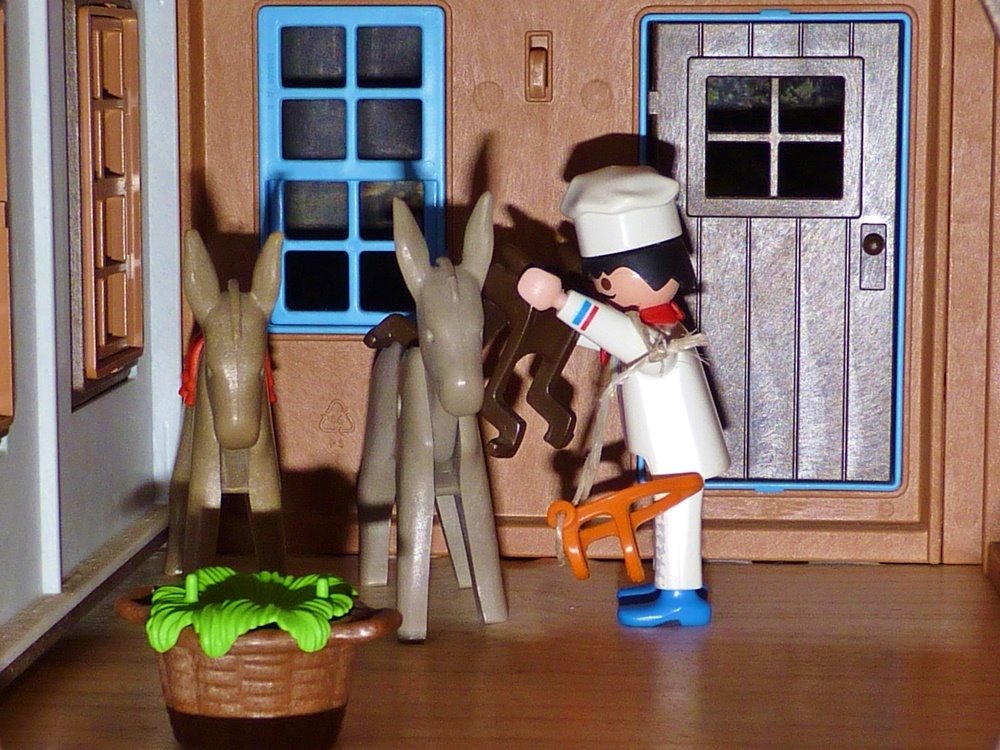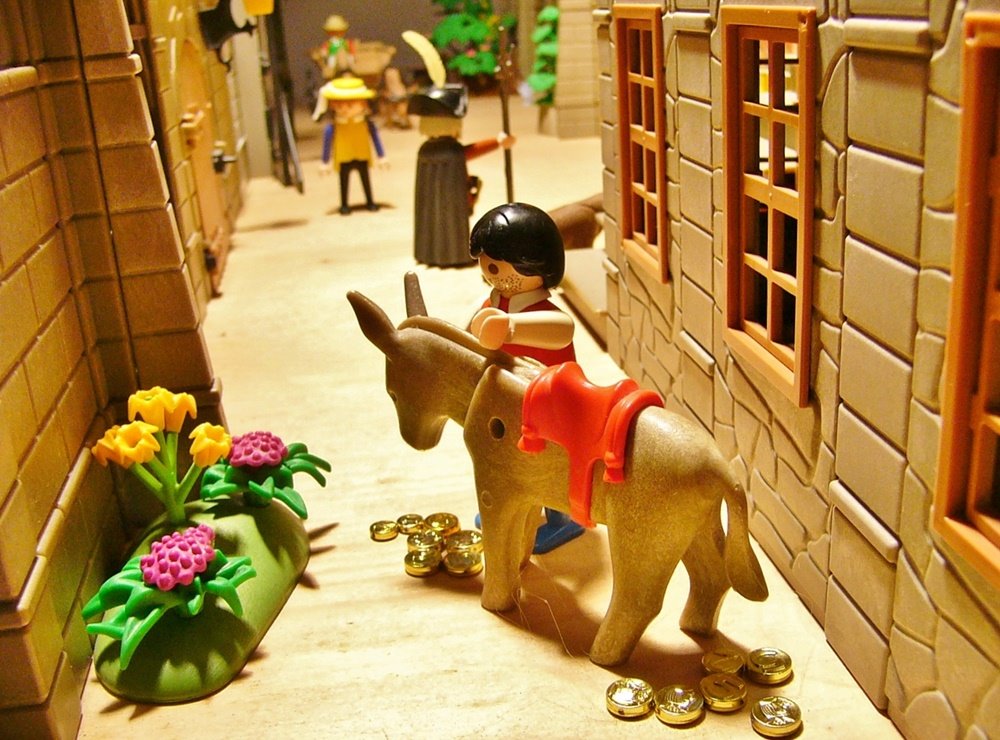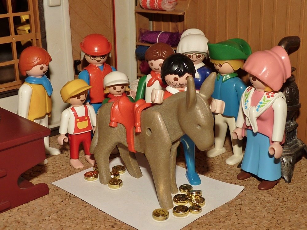 Sobald sie beisammen waren, hieß sie der Müller Platz machen, breitete sein Tuch aus und brachte den Esel in die Stube. „Jetzt gebt acht!“, sagte er und rief: „Bricklebrit“ - aber es waren keine Goldstücke, was herabfiel, und es zeigte sich, dass das Tier nichts von der Kunst verstand, denn es bringt nicht jeder Esel so weit.