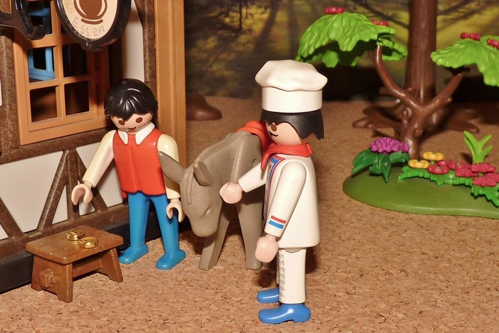 „Ei der Tausend“, sagte der Wirt, „da sind die Dukaten bald geprägt! So ein Geldbeutel ist nicht übel!“ Der Gast bezahlte seine Zeche und legte sich schlafen; der Wirt aber schlich in der Nacht hinab in den Stall, führte den Münzmeister weg und band einen andern Esel an seine Stelle.