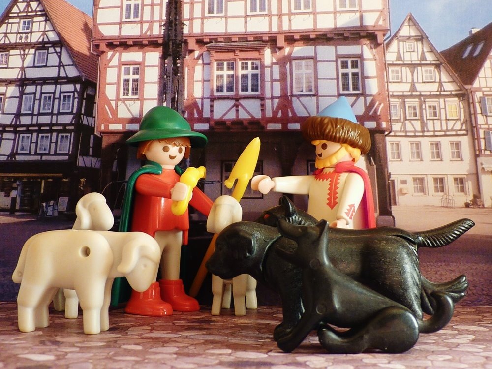 Dein neues Märchen mit den 3 Hunden kannte ich bisher noch nicht. Wie du das alles aber wieder in Szene gesetzt hast ist einfach spitze. Wenn ich mich recht erinnere, hast du sogar zum ersten Mal eine Märchenszene ins freie verlegt, oder? Und auch das Hintergrundbild auf dem Marktplatz kommt richtig gut. Ich bin wieder begeistert und freue mich schon auf das nächste Märchen