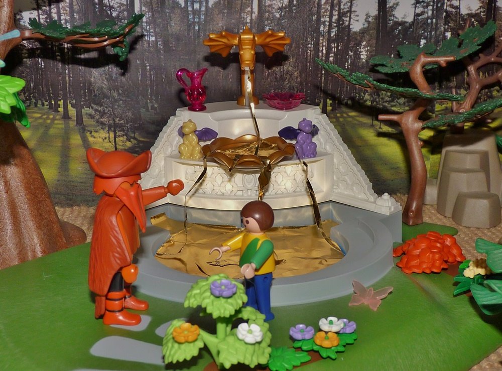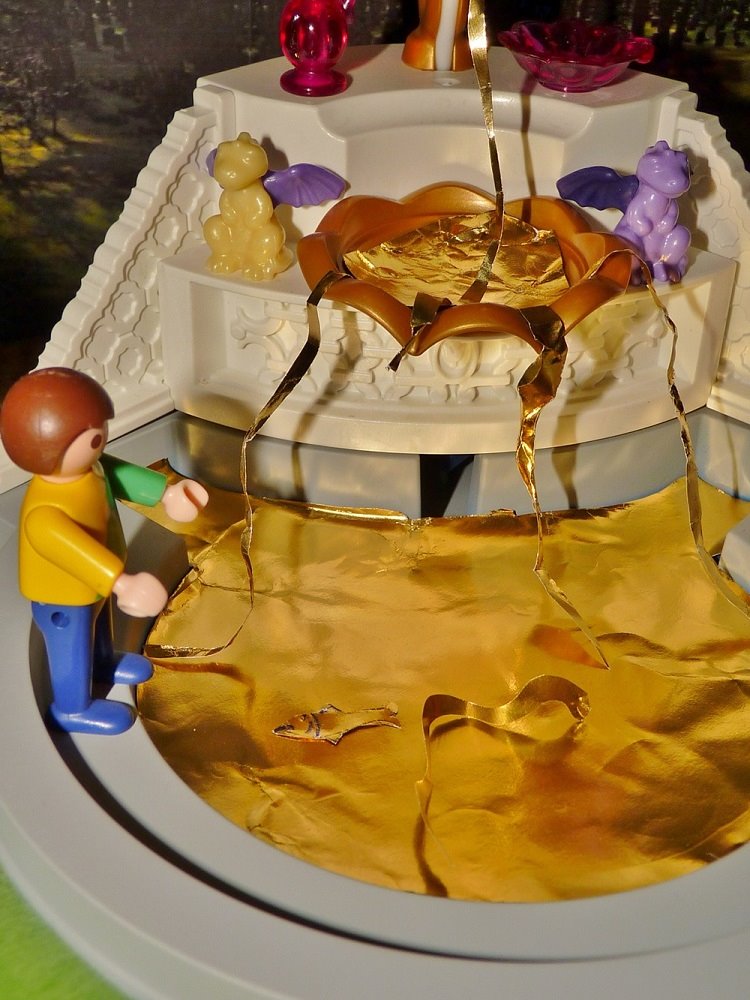Der Knabe setzte sich an den Rand des Brunnens, sah, wie sich manchmal ein goldener Fisch, manchmal eine goldene Schlange darin zeigte, und er hatte acht, dass nichts hineinfiel. Als er so saß, schmerzte ihn einmal sein Finger so heftig, dass er ihn unwillkürlich in das Wasser steckte. Er zog ihn schnell wieder heraus, sah aber, dass er ganz vergoldet war, und wie große Mühe er sich gab, das Gold wieder abzuwischen, es war alles vergeblich.