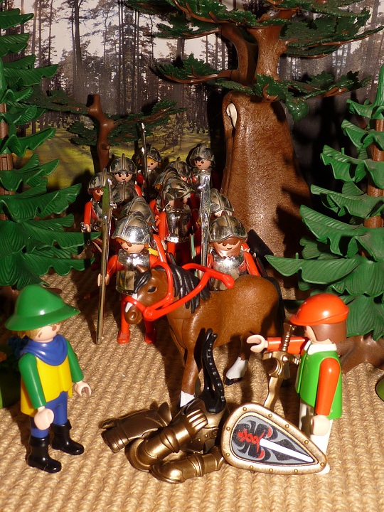 Dann ging der wilde Mann in den Wald zurück, und es dauerte nicht lange, so kam ein Stallknecht aus dem Walde und führte ein Ross herbei, das schnaubte aus seinen Nüstern und war kaum zu bändigen. Und hinterher folgte eine große Schar Kriegsvolk, ganz in Eisen gerüstet, und ihre Rüstungen und Waffen blitzten in der Sonne.