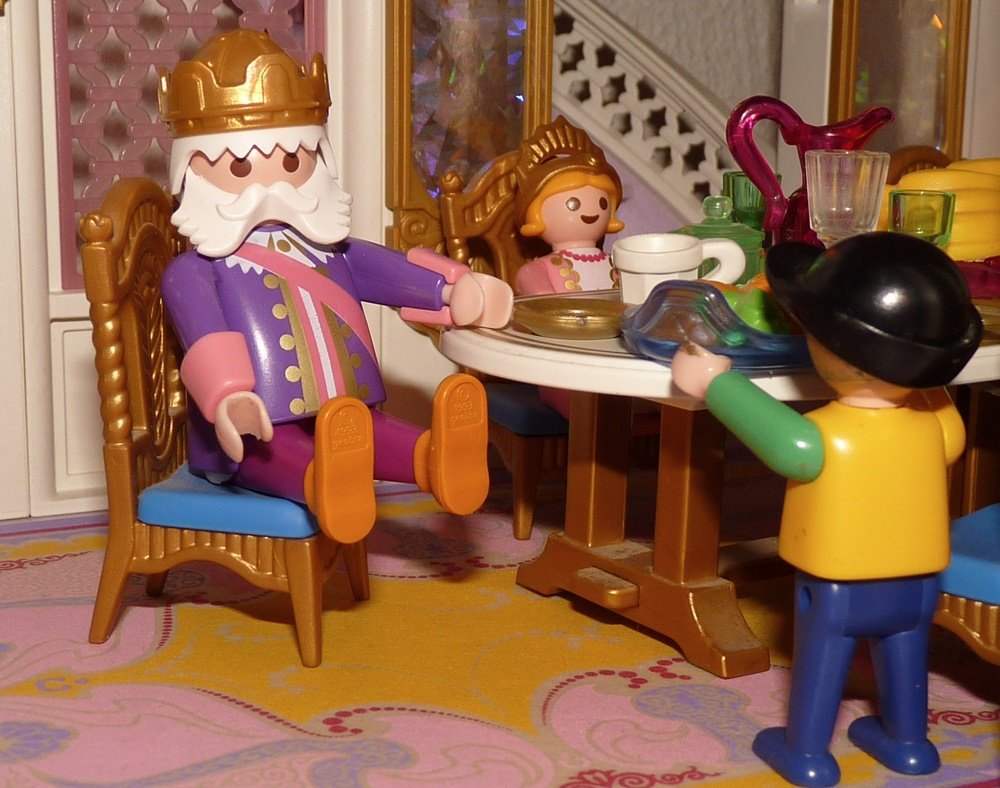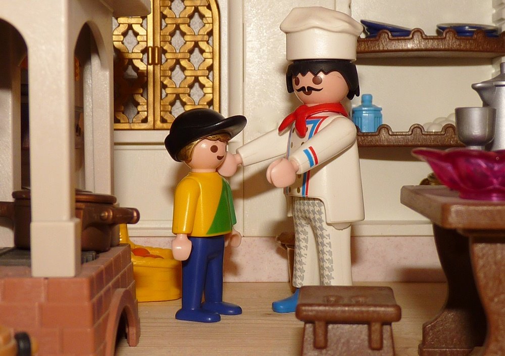 Zuletzt nahm ihn der Koch in den Dienst und sagte, er könnte Holz und Wasser tragen und die Asche zusammenkehren. Einmal, als gerade kein anderer zur Hand war, hieß ihn der Koch die Speisen zur königlichen Tafel tragen; da er aber seine goldenen Haare nicht wollte sehen lassen, so behielt er sein Hütchen auf.