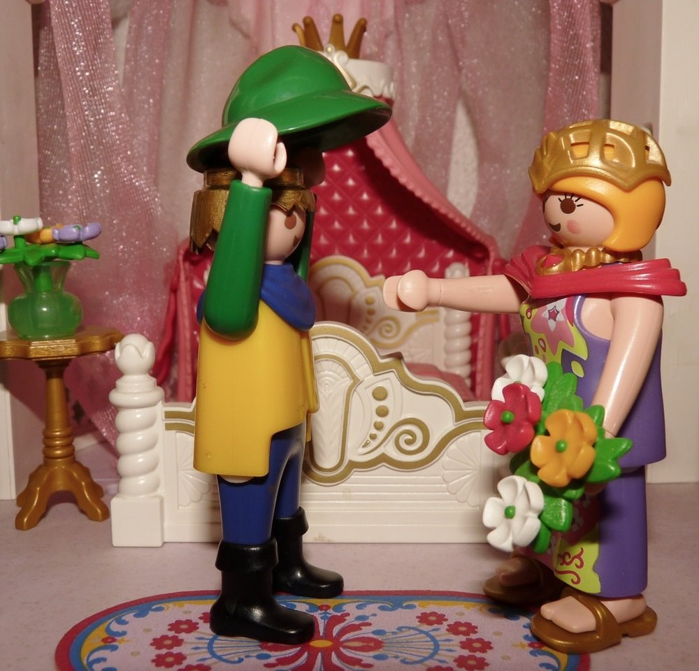 Die Strahlen fielen in das Schlafzimmer der Königstochter und sie aufsprang, um zu sehen, was das wäre. Da erblickte sie den Gärtnergehilfen und rief ihn an: „Junge, bring mir einen Blumenstrauß.“ Er setzte in aller Eile sein Hütchen auf, brach wilde Feldblumen ab und band sie zusammen.