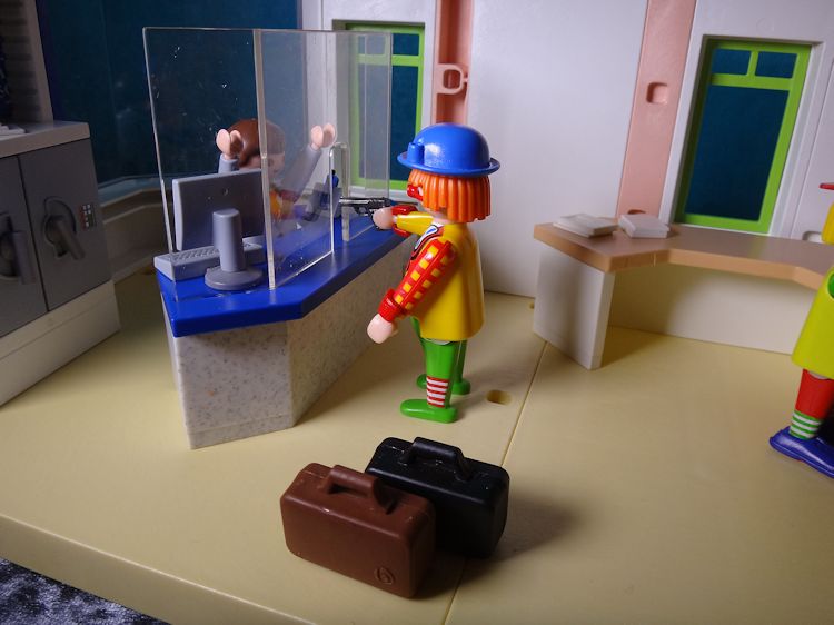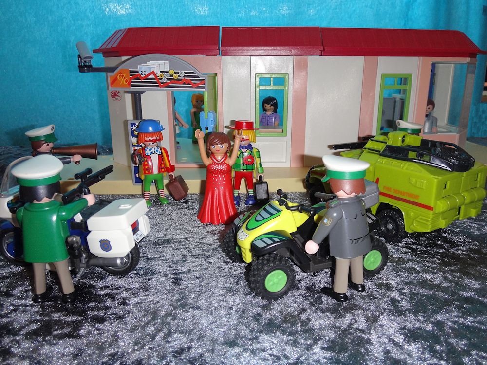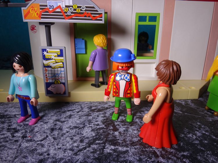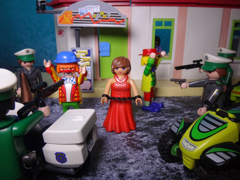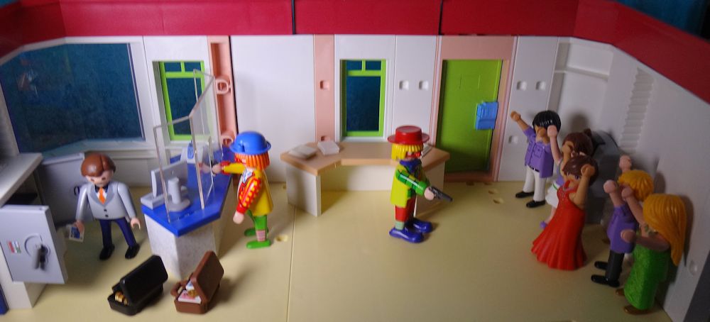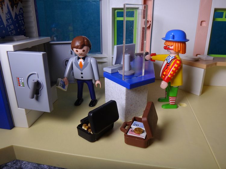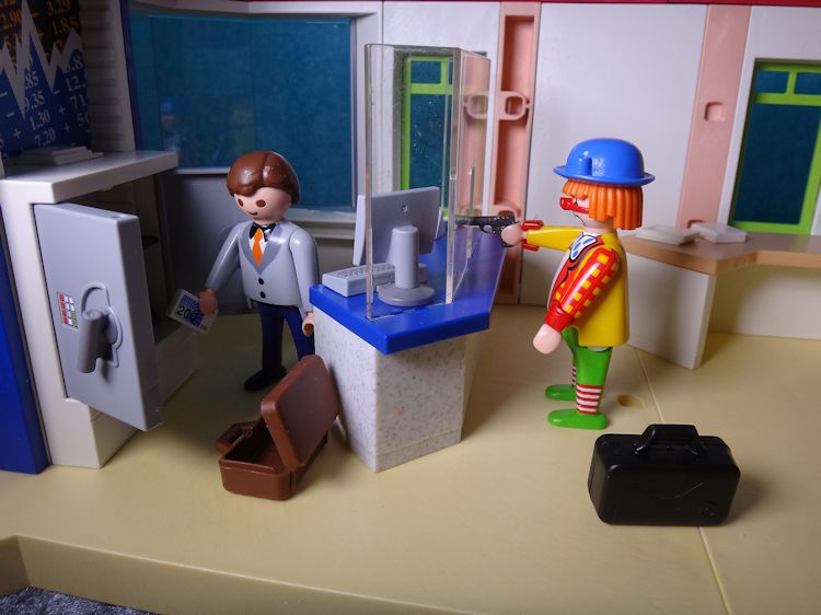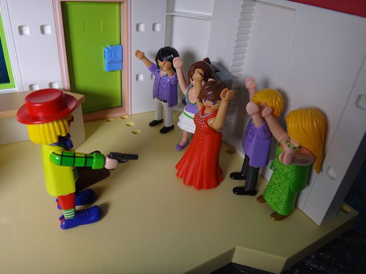 Mit gezogener Waffe stürmt der Clown von vorhin in die Bank und ruft: