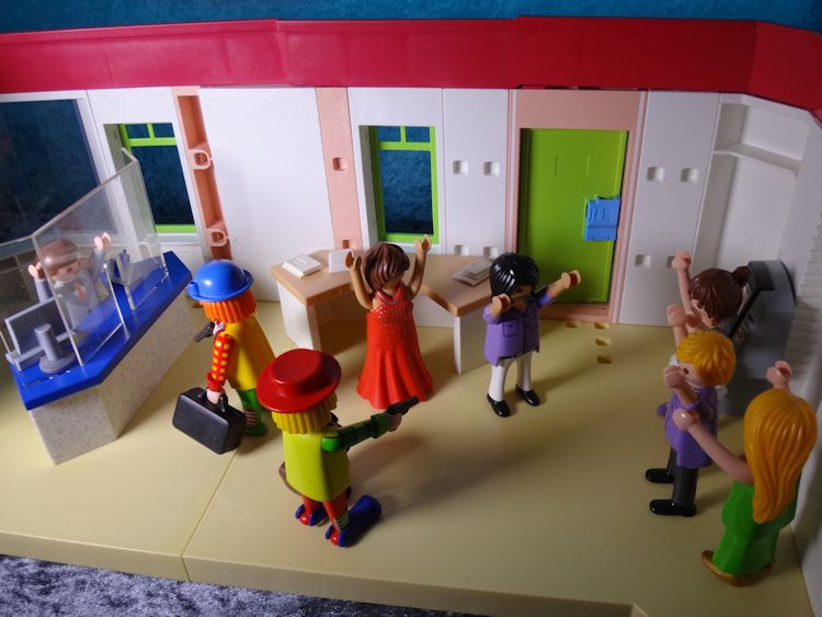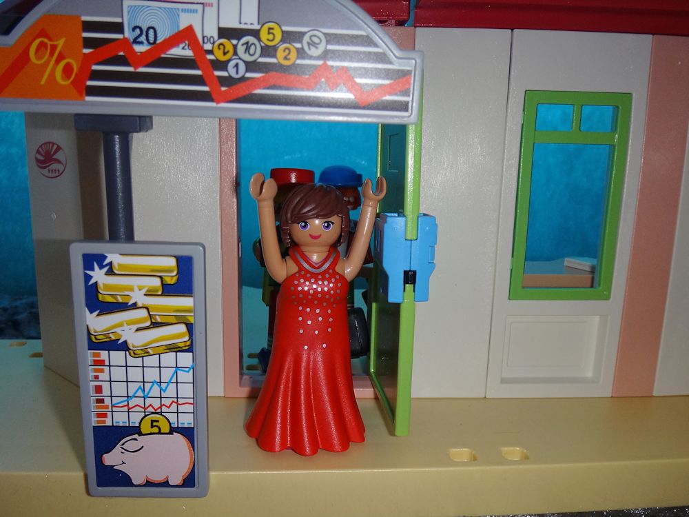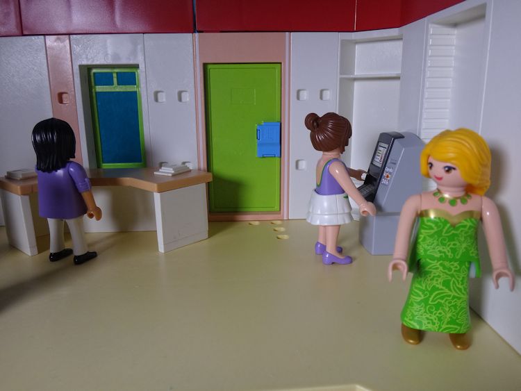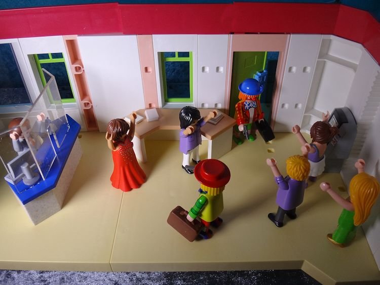 Da so eine Pistole schon ziemlich gefährlich ist, gehorchen alle, die in der Bank sind.