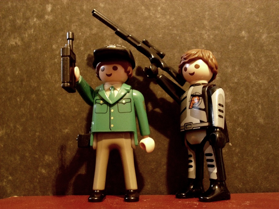 Beide halten die Pistolen schussbereit.