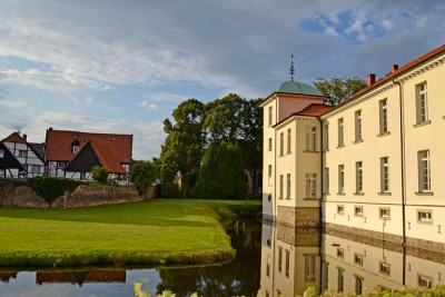 abgesetzten Laibungen und geschweiften Giebeln gruppieren sich um einen Ehrenhof. Die klare Struktur der alten Gebäude hat trotz